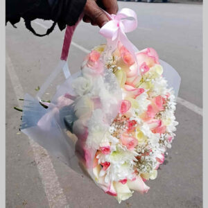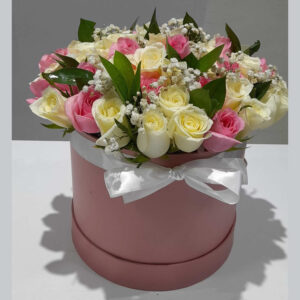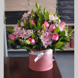 KShs5,500This pretty arrangement in shades of pink and creamy white brings all the charm of a rustic country garden to the people you care about. Classic roses are placed next to lush greenery and chrysanthemums in a round box, creating a beautiful gift that delights with every detail.