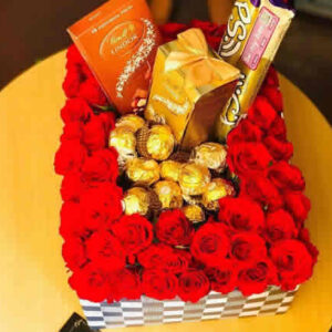 Here’s a lovely hamper to wish a lovely Birthday,Anniversary,Mother’s Day , Father’s Day. Say,”I Love You ”, “thank you just for being you” with a gift like this symbolizing all the moments of a love that has meant a great deal and always will.Composition; red roses,2 pcs lindt chocolates,ferrero chocolate 16pcs, 2 cadbury chocolates well packaged in a box.
