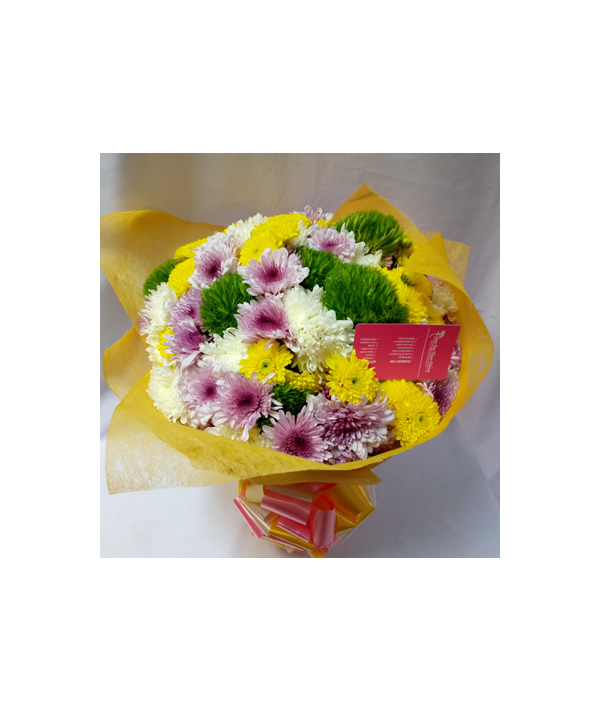 A hand-tied bouquet of multicolored chrysanthemums.